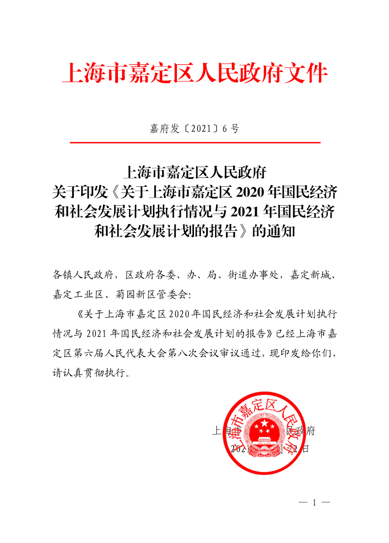 索引号: 00001434-9/2021-00058 发布机构: 区发展改革委 发文日期: 2021年02月24日 主题分类: 嘉定区国民经济和社会发展年度计划执行情况与年度计划的报告 关键词: 关于上海市嘉定区2020年国民经济和社会发展计划执行情况与2021年国民经济和社会发展计划的报告 发布时间:2021-02-24 浏览次数: 次 【字体:小 大】